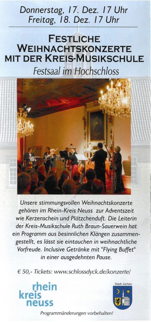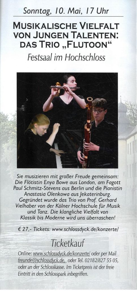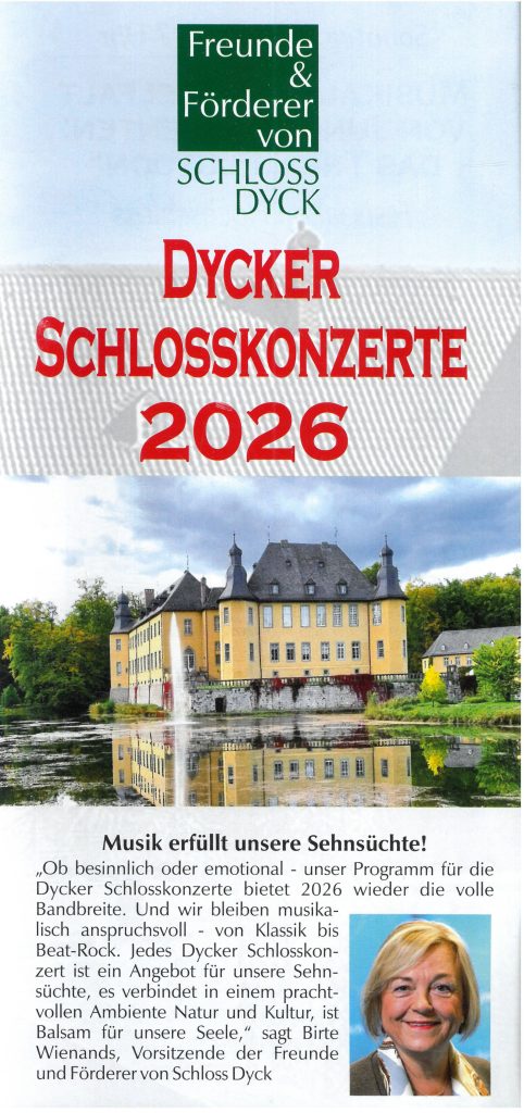 Der Vorstand des Heimatvereins ist freundschaftlich mit dem Vorstand des Vereins der Freunde und Förderer von Schloss Dyck e.V verbunden. Deshalb baben wir beschlossen, die Mitglieder*innen des Heimatvereins auf die hervorragenden kulturellen Ereignisse aufmerksam zu machen, die auf Schloss Dyck regelmäßig stattfinden.
