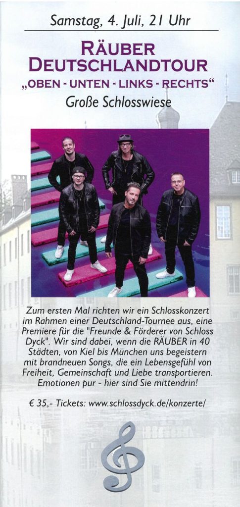 Trotz dieser Bodenständigkeit immer auf’s Neue kreativ zu sein, das haben „Die Räuber“ in den über dreißig Jahren ihres Bestehens stets bewiesen. So konnte seit 2018 der Sänger Sven West aus Grevenbroich für neue melodische Impulse sorgen, geblieben sind dagegen die Musiker Andreas Dorn (Gitarre) und Kurt Feller (Keyboard) – gleichermaßen als festes Gerüst. „Diese Mischung aus klassischen Ohrwürmern und fetzigen Beatrhythmen scheint jedenfalls anzukommen bei den Fans, mal wird geschunkelt, mal bebt die Schlosswiese. Im Ambiente von Schloss Dyck dürfen wir uns auf ein Open-Air-Konzert mit ganz besonderer Atmosphäre freuen,“ sagt Birte Wienands, selbst Mitglied der Meerbuscher Räuber-Fangemeinde und Vorsitzende des Vereins „Freunde & Förderer von Schloss Dyck“, der dieses Konzert veranstaltet. Es beginnt um 21 Uhr auf der Wiese am Schlossteich, Einlass ist ab 20 Uhr.